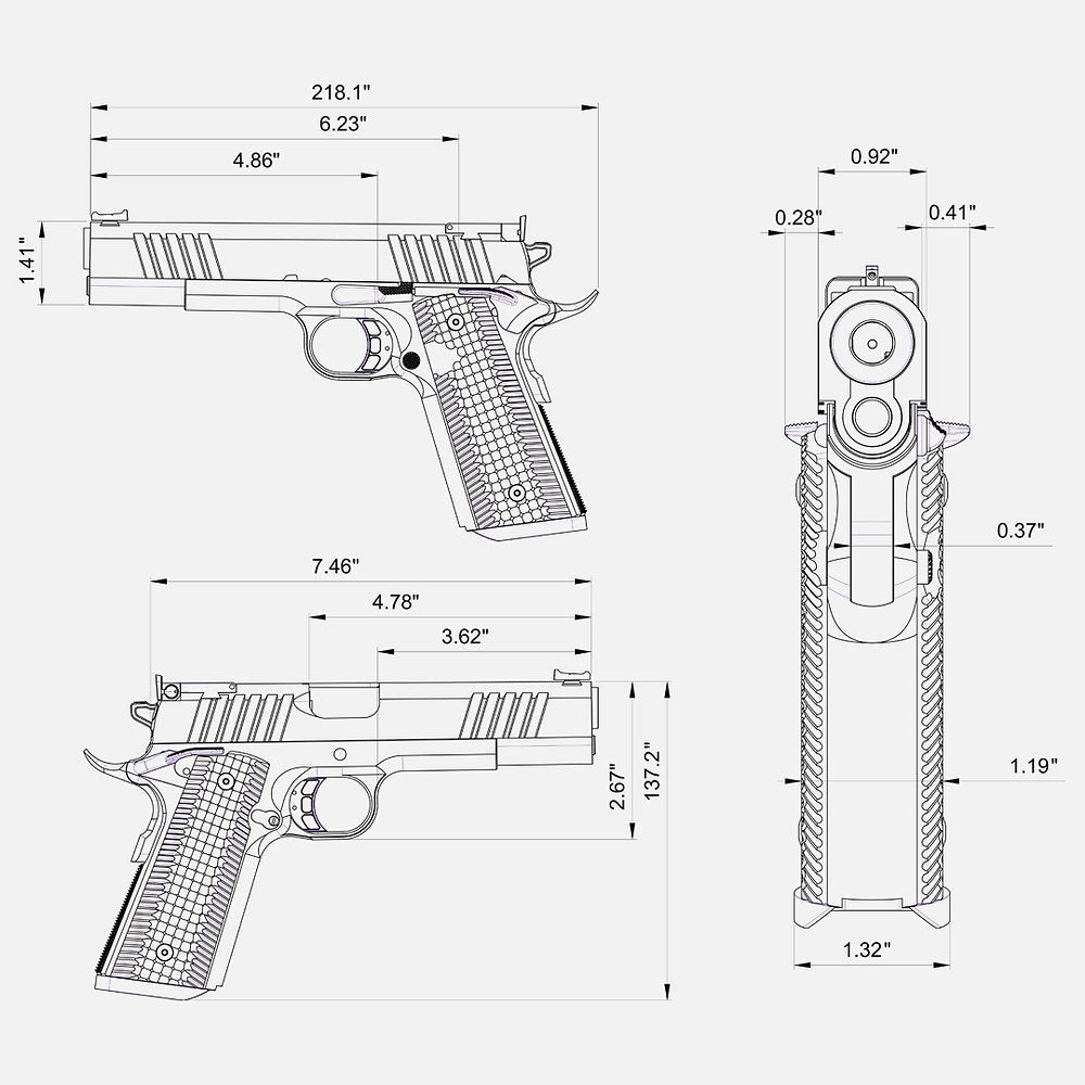 Weight: 9mm bull barrel (unloaded): 1162g / 2.5lbs